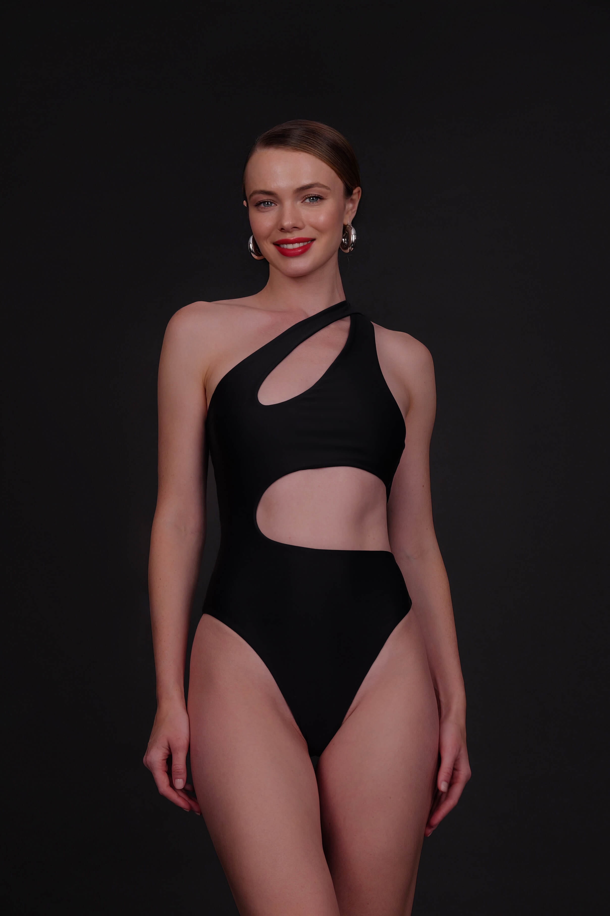Silhouette: A one-piece monokini with an asymmetric cut, featuring bold yet elegant cutouts that enhance the natural body lines.