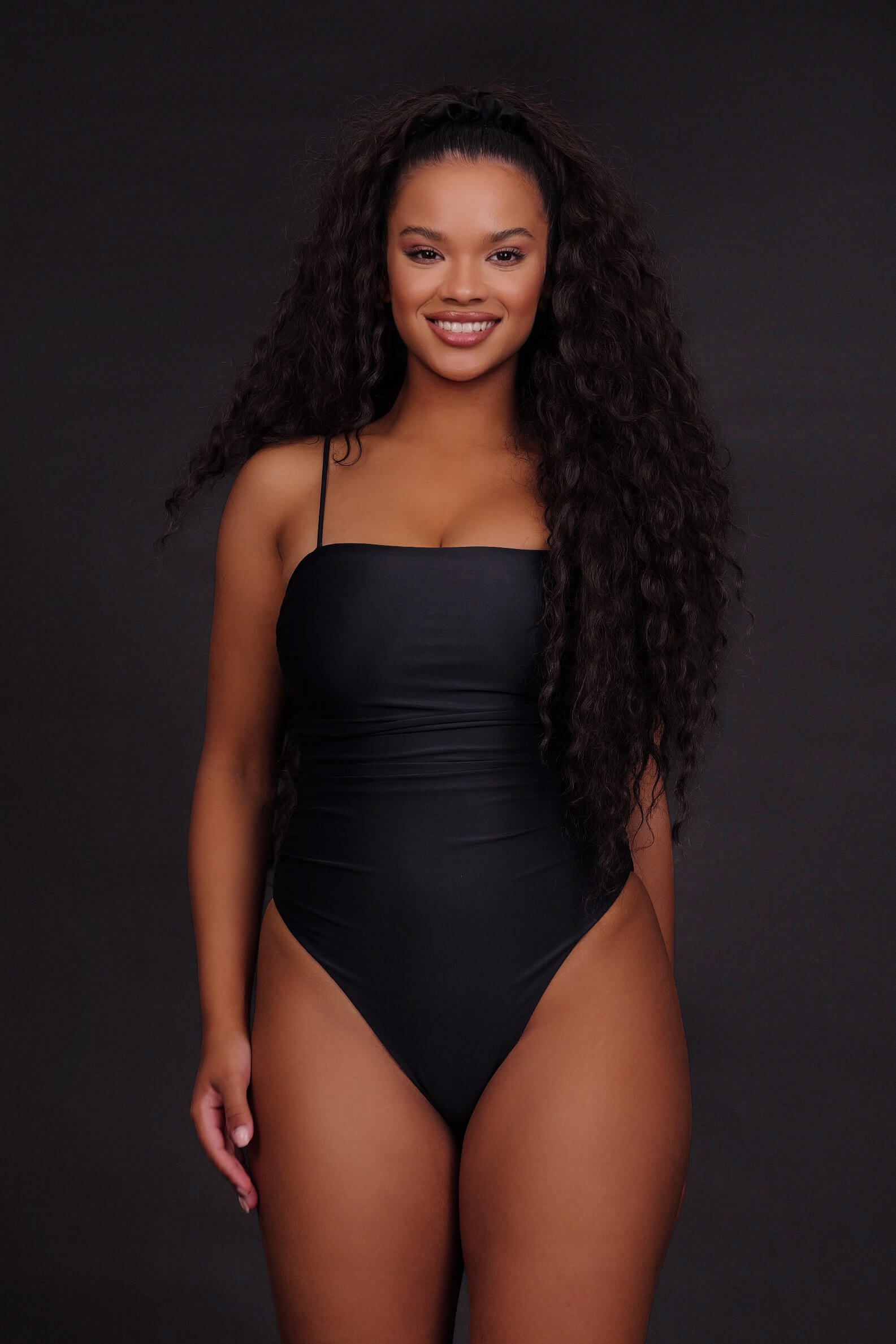 Bottom Cut: Medium to high leg cut – elongates the legs while providing moderate coverage.