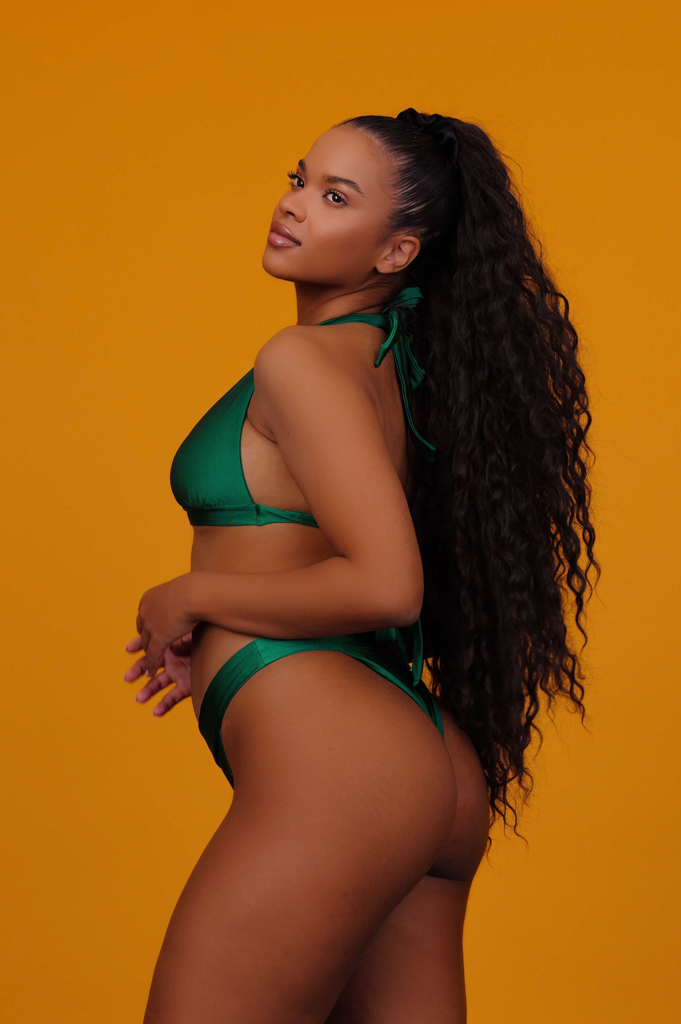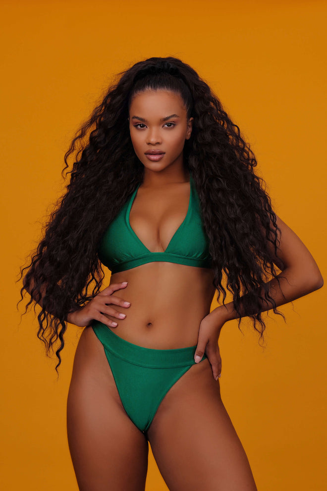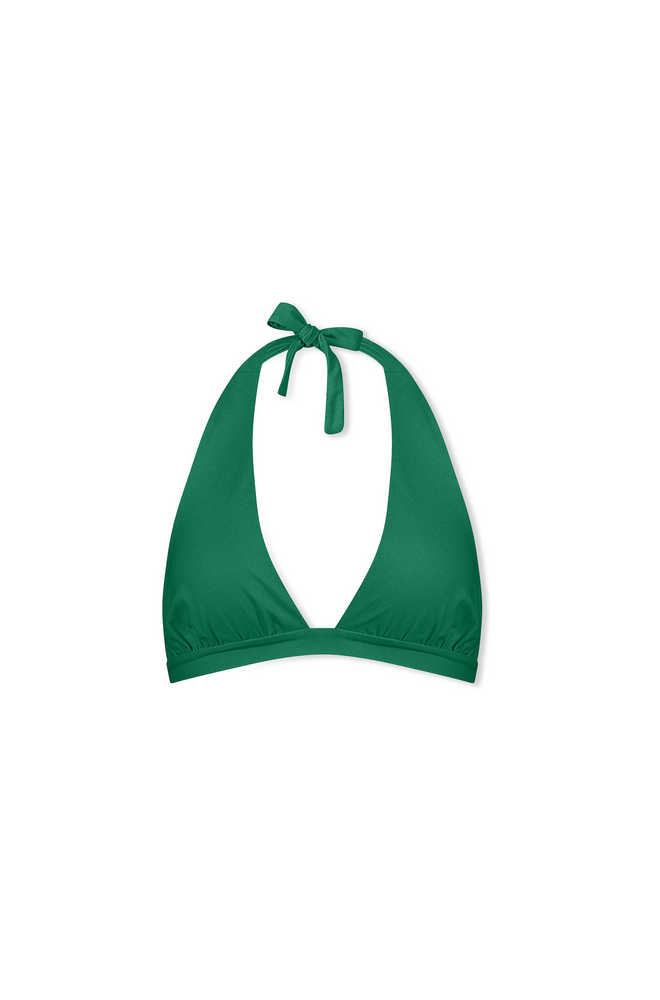 A deep halter-neck bikini top with wide back ties, designed for an elegant and defined look. It offers great support and a bold presence.
