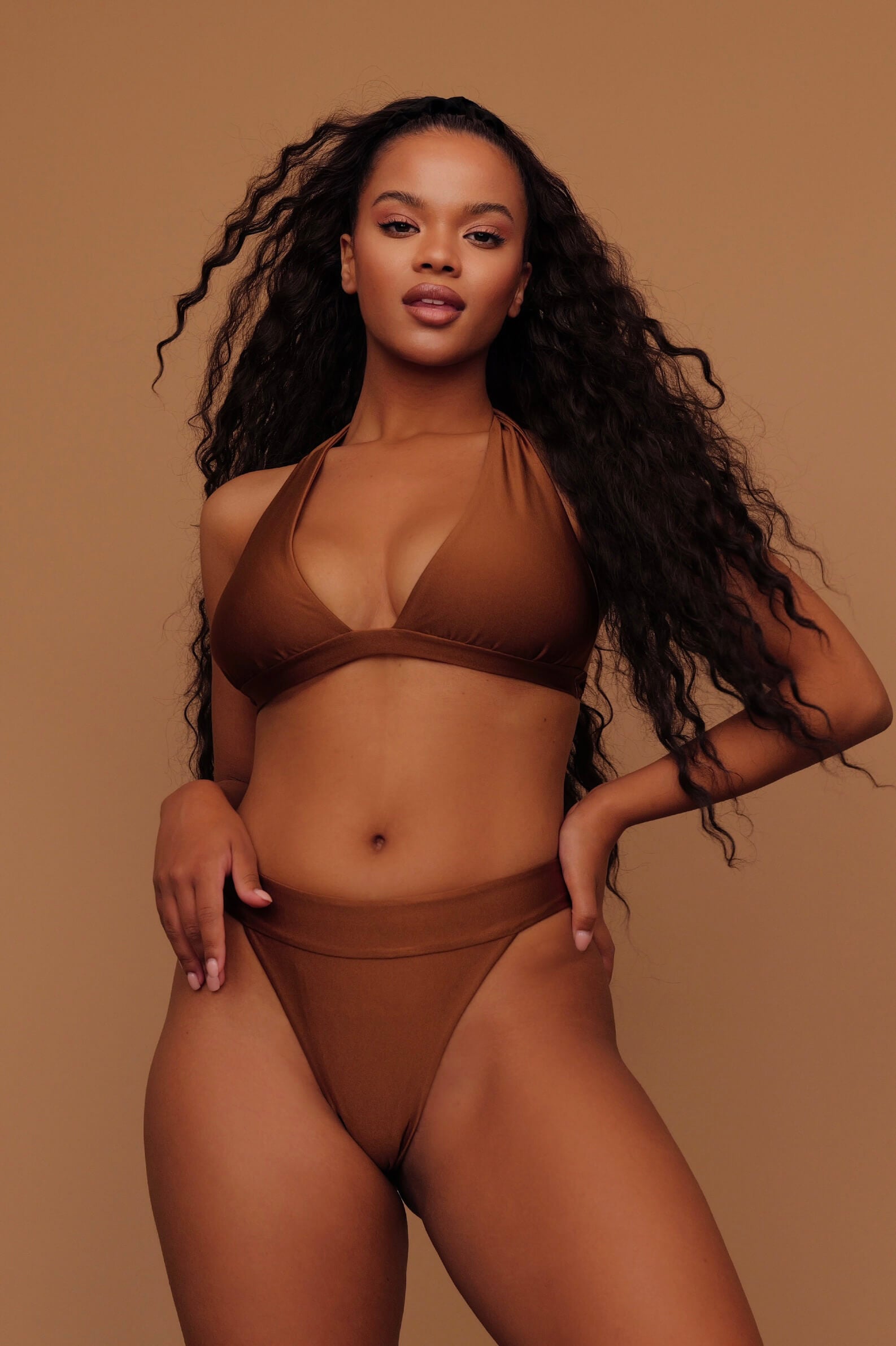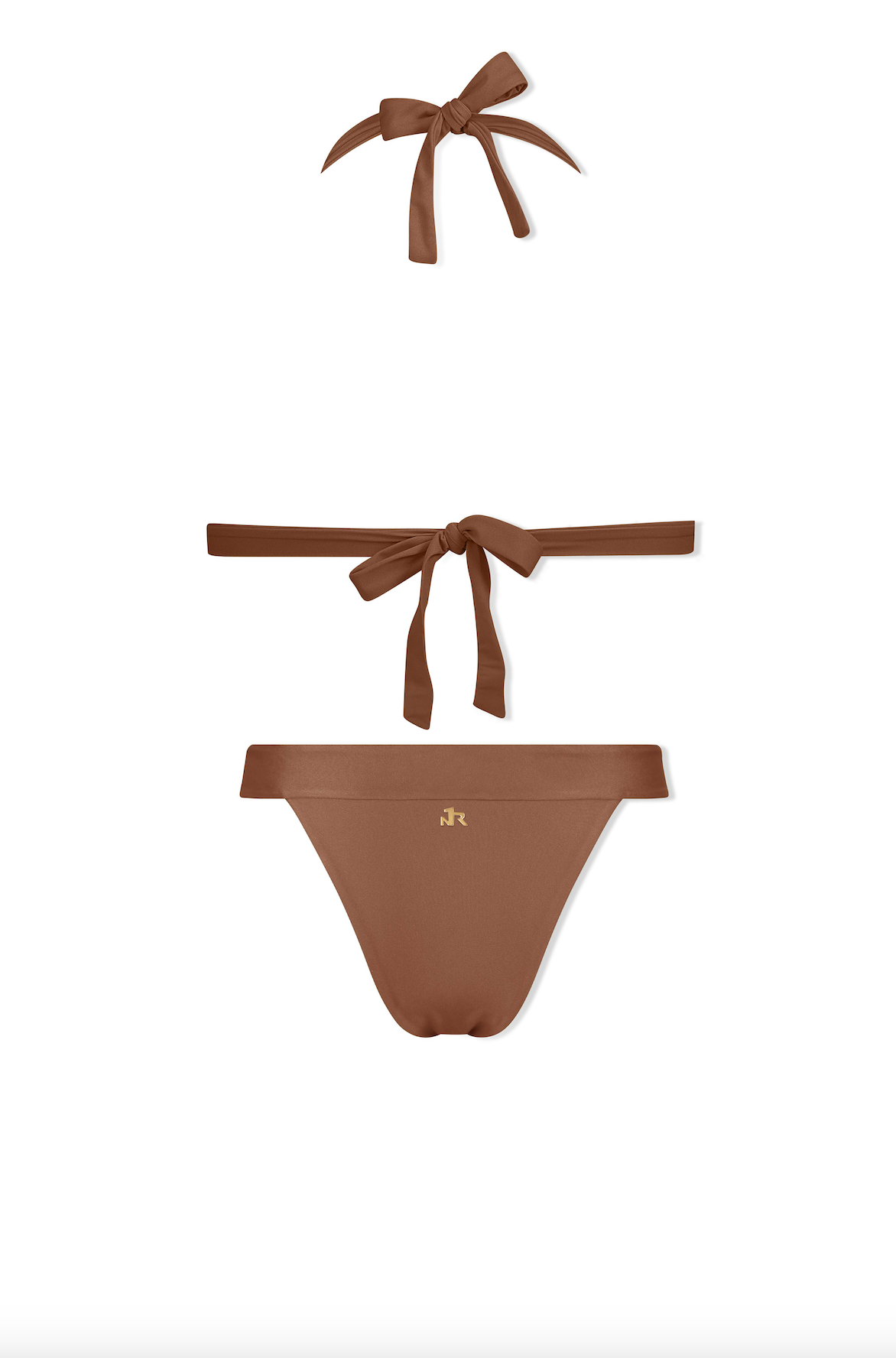 A deep halter-neck bikini top with wide back ties, designed for an elegant and defined look. It offers great support and a bold presence.