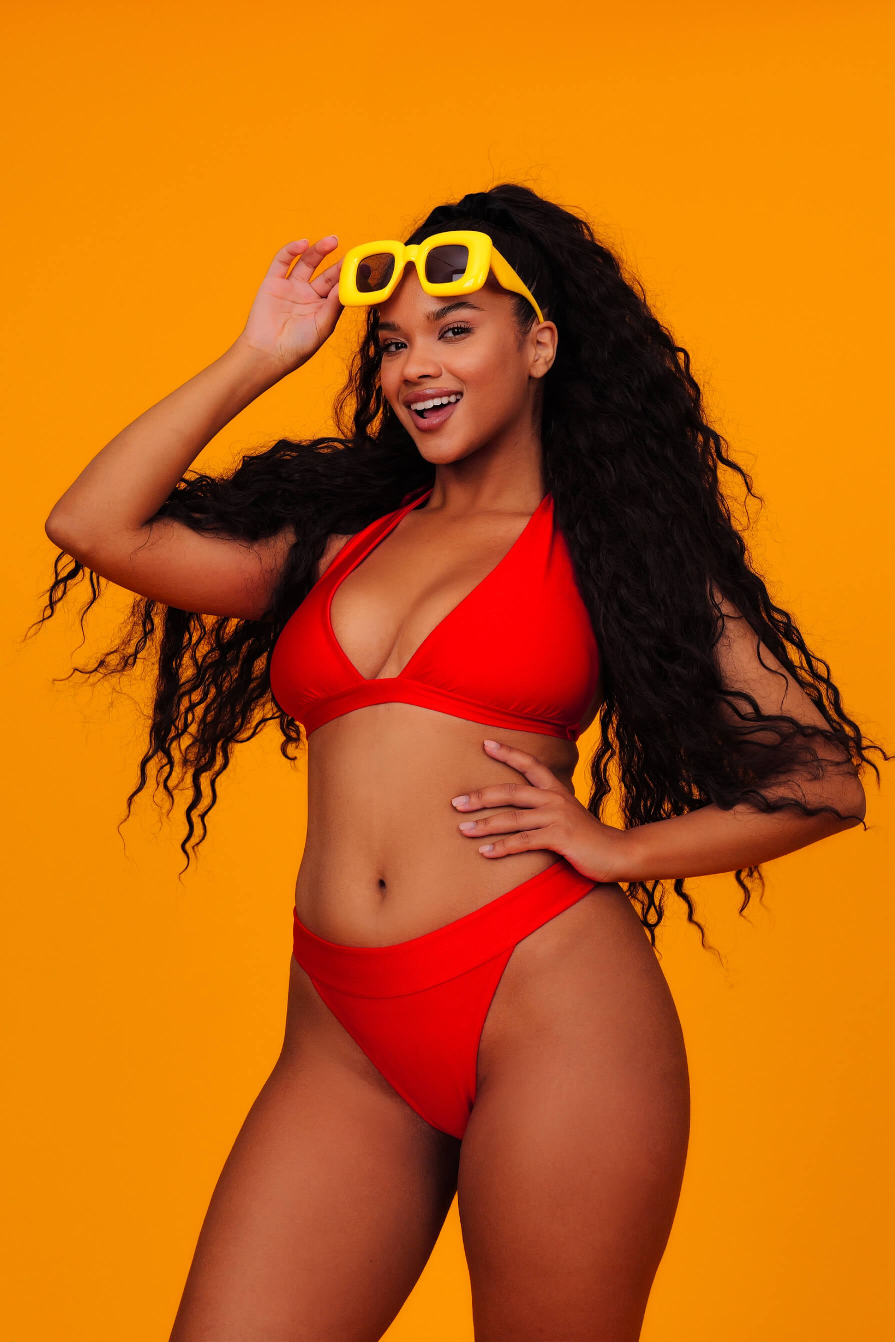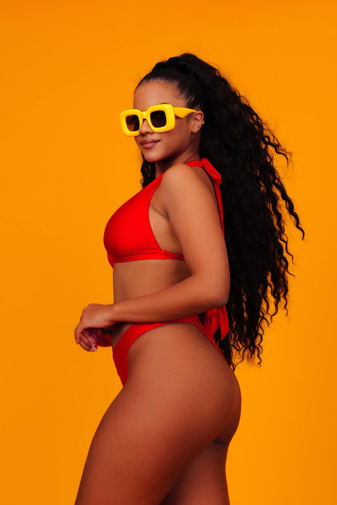 A deep halter-neck bikini top with wide back ties, designed for an elegant and defined look. It offers great support and a bold presence.