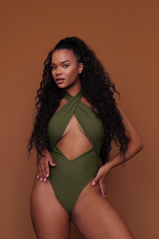 Silhouette Type: Modern one-piece swimsuit with a dramatic cut-out front, mimicking a monokini style. Top Design: Wide crossover straps at the bust that tie around the neck, creating a bold halter neckline.Front Cutout: Large central cutout