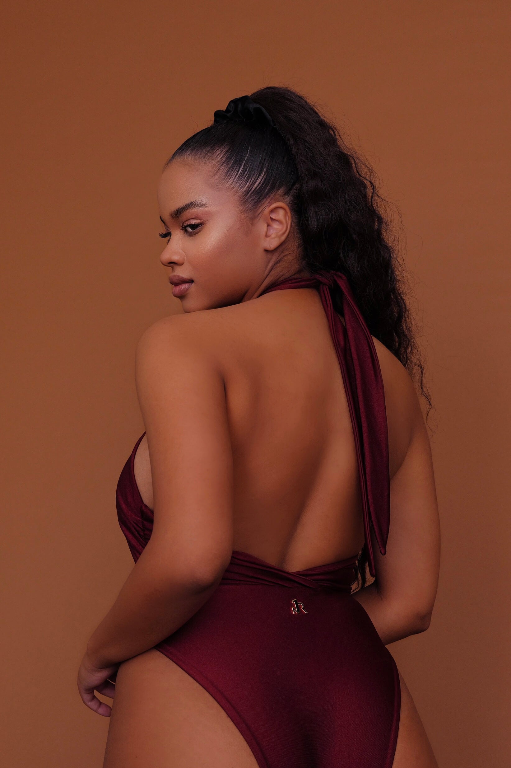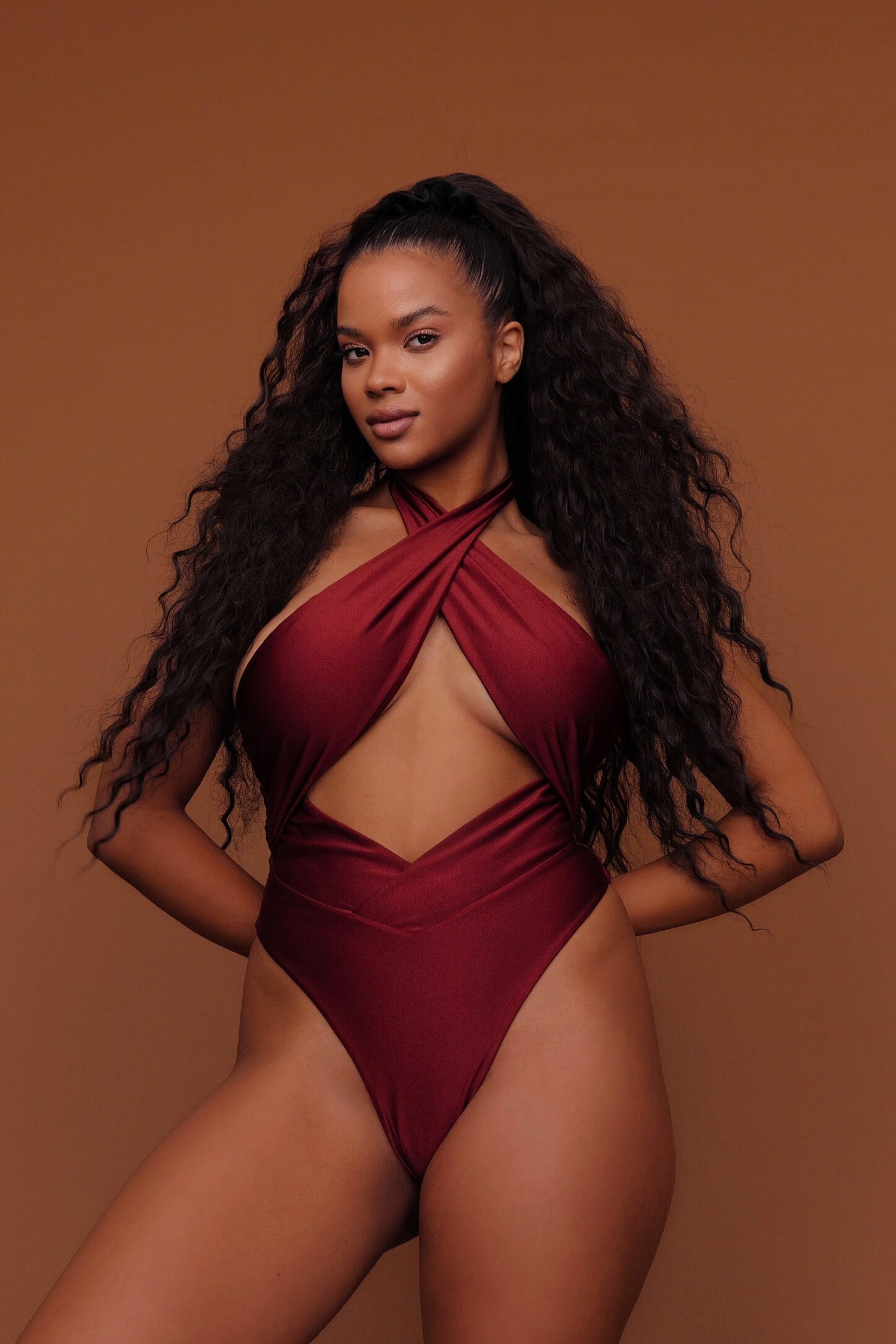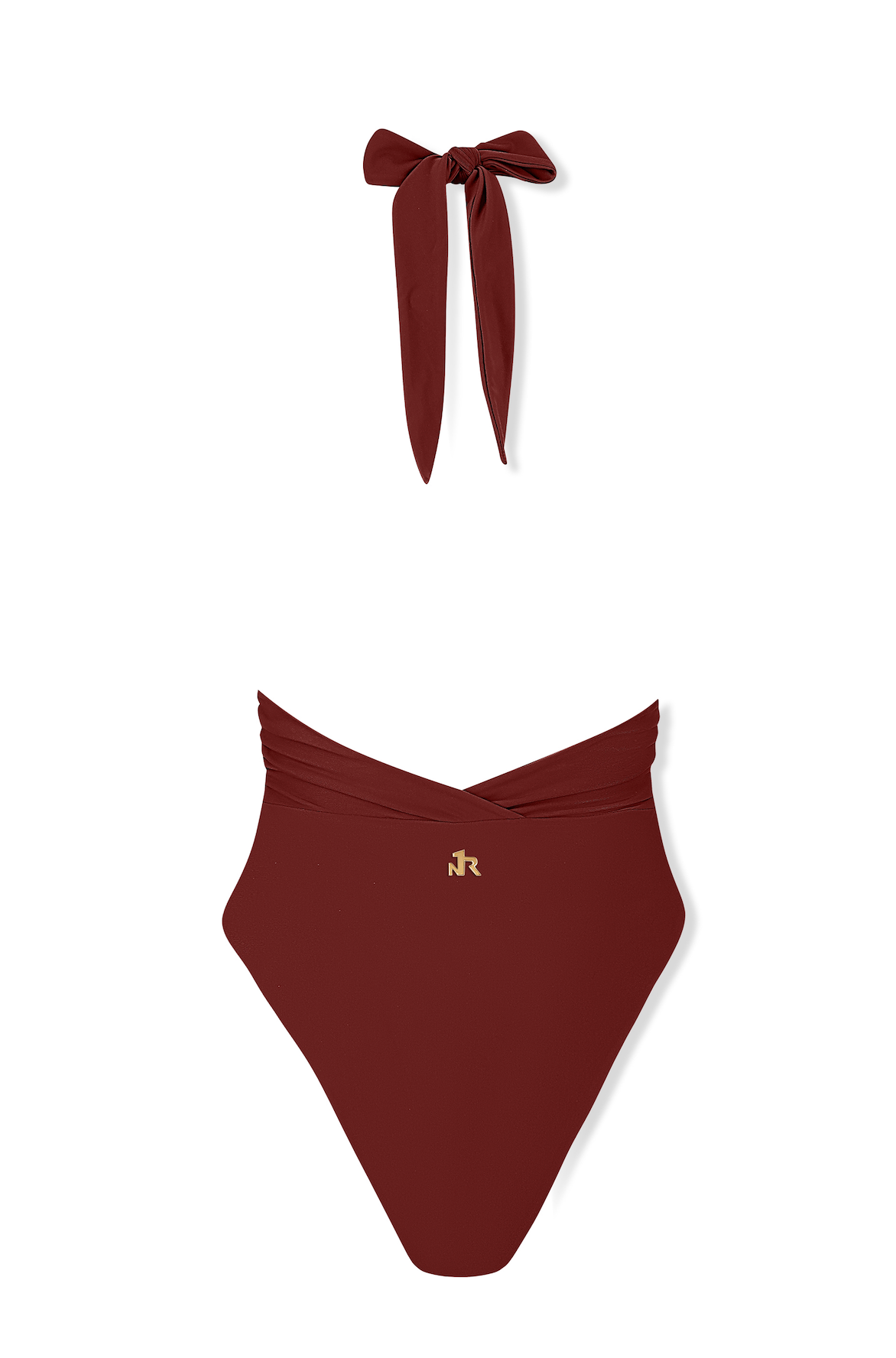 Silhouette Type: Modern one-piece swimsuit with a dramatic cut-out front, mimicking a monokini style. Top Design: Wide crossover straps at the bust that tie around the neck, creating a bold halter neckline.Front Cutout: Large central cutout