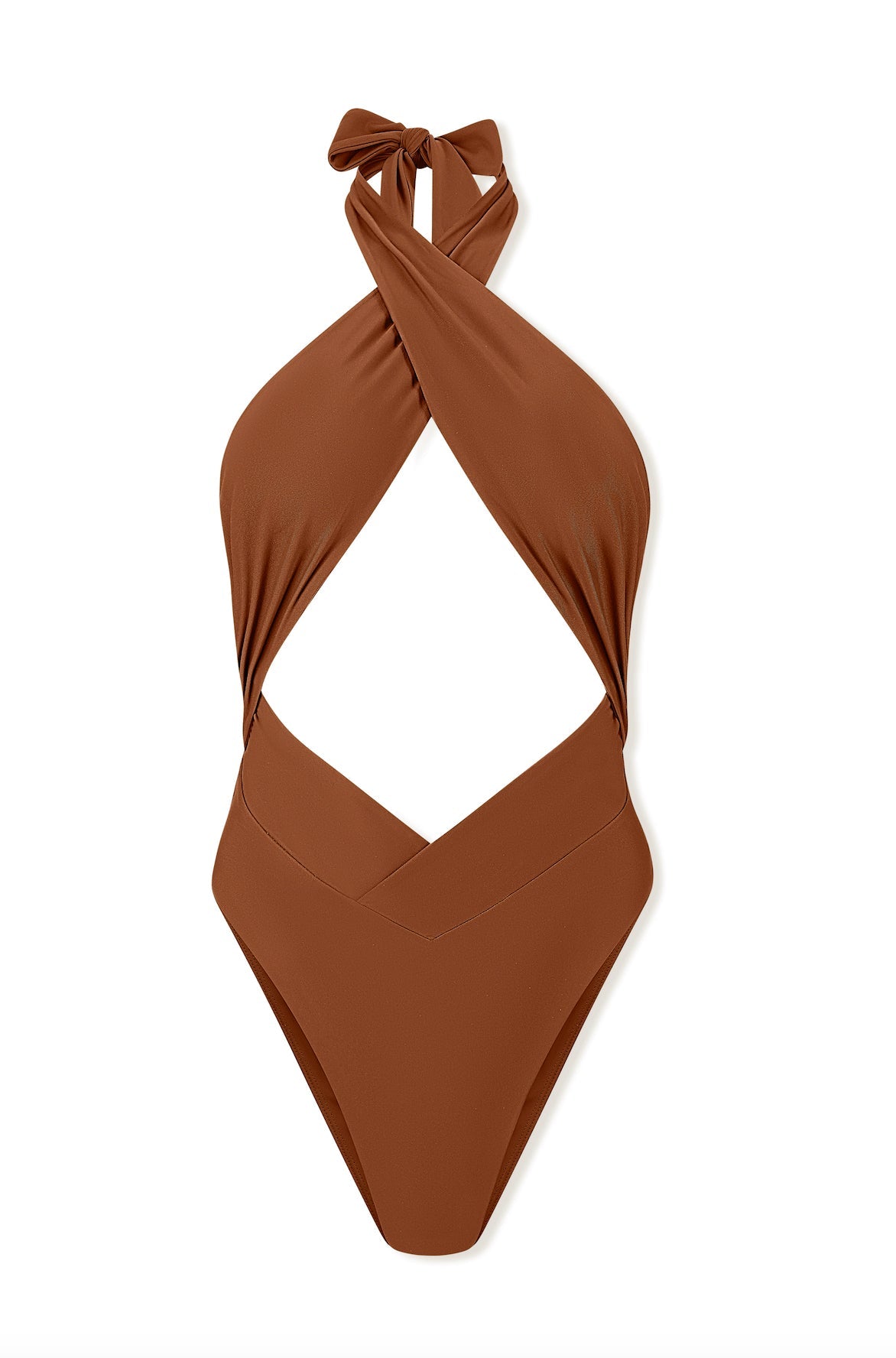 Silhouette Type: Modern one-piece swimsuit with a dramatic cut-out front, mimicking a monokini style. Top Design: Wide crossover straps at the bust that tie around the neck, creating a bold halter neckline.Front Cutout: Large central cutout