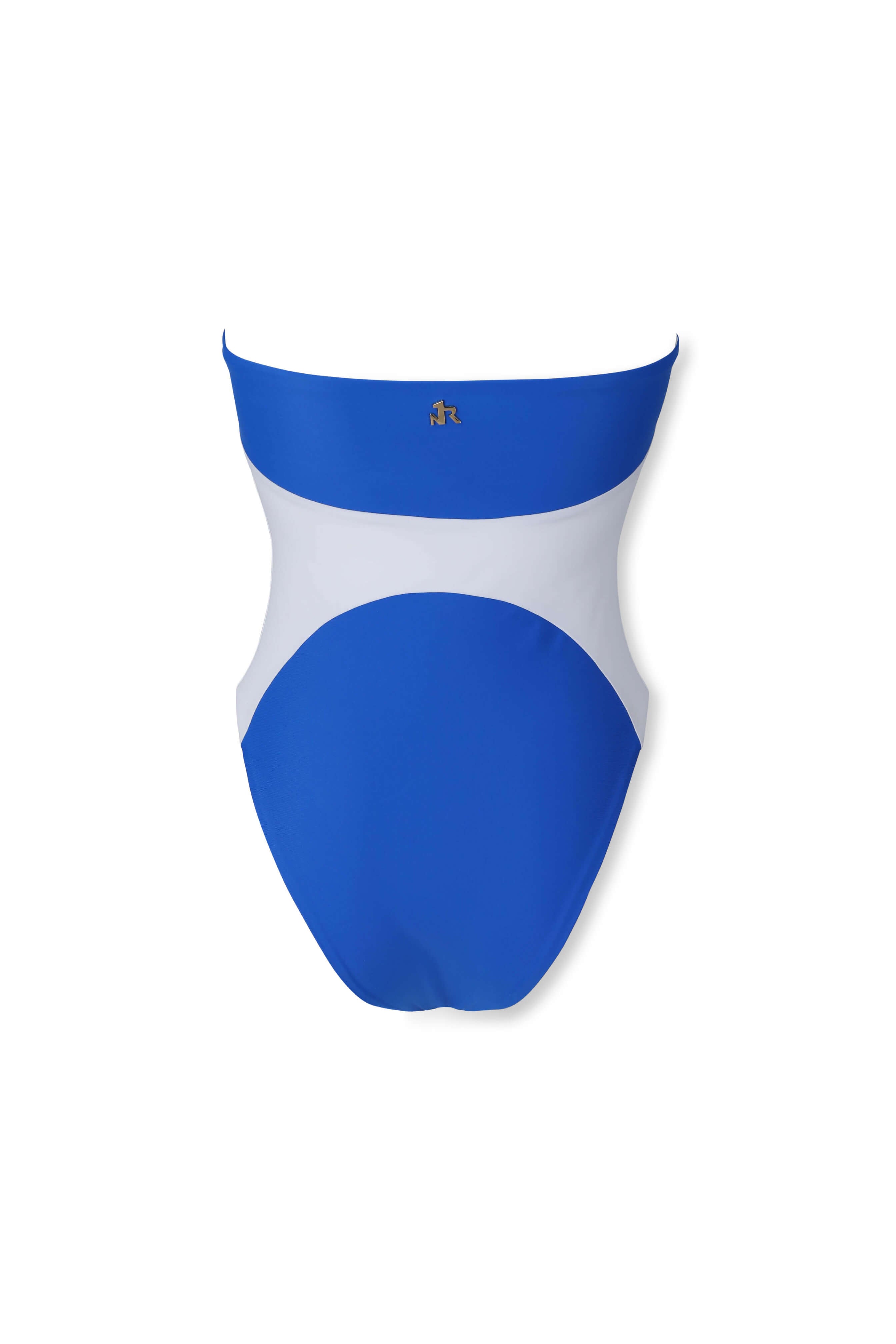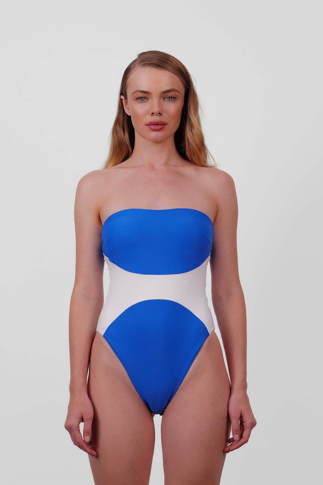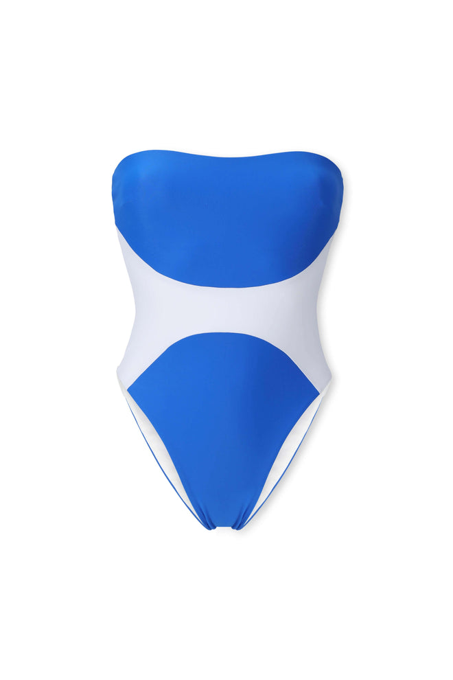 • Silhouette Type: Strapless one-piece with contrast paneling that defines the waist.