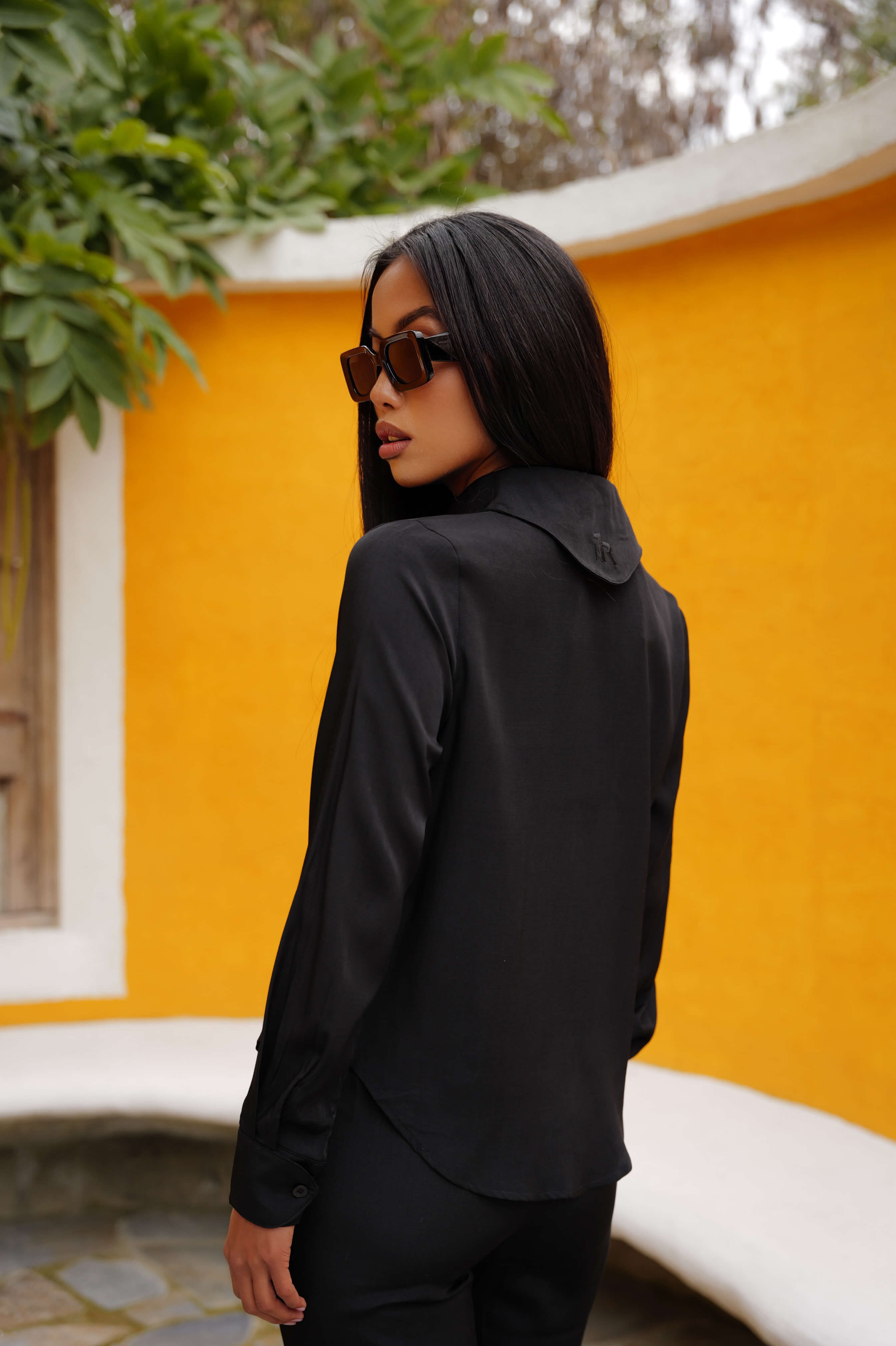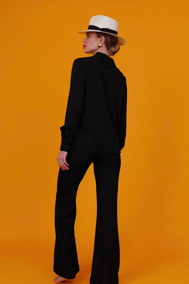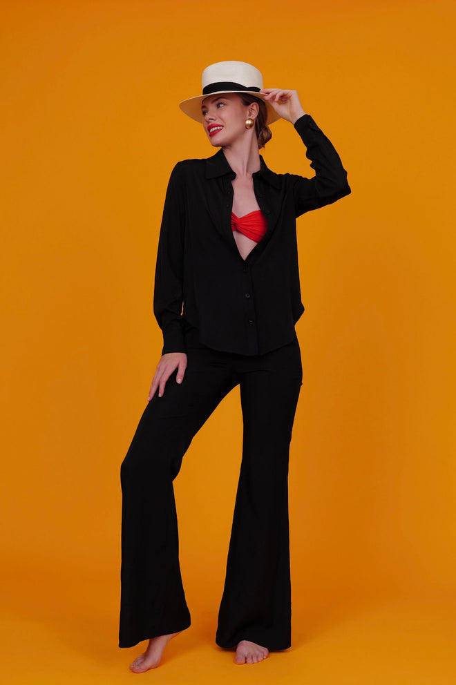 This refined two-piece set is crafted from lightweight, semi-sheer 100% polyester fabric with a subtle sheen, offering a fluid drape and breathable comfort. The long-sleeve shirt features a relaxed, oversized fit with a classic collar, buttoned cuffs, and a soft, flowing silhouette that can be worn open or styled as a light outer layer. The high-waisted pants are designed with a flattering wide-leg cut, an elastic waistband for a comfortable fit, and a smooth finish that elongates the body. Perfect for effortless elegance, this set blends sophistication with ease, ideal for warm evenings or elevated daytime dressing.
