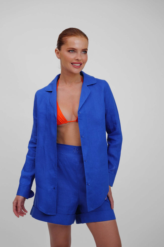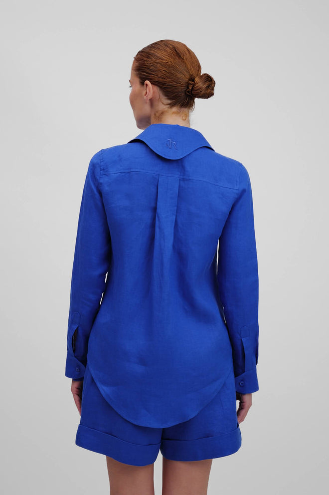 Crafted from 100% natural linen, this lightweight long-sleeve shirt features a relaxed, slightly oversized fit for maximum comfort. It’s designed with a classic collar, soft lapels, and a clean button down front, offering breathability and effortless elegance. A unique touch is added with a special back collar detail, featuring an intricately embroidered logo that elevates the design with a signature finish. The natural texture of the linen provides a refined yet laid back look, perfect for layering or wearing on its own.