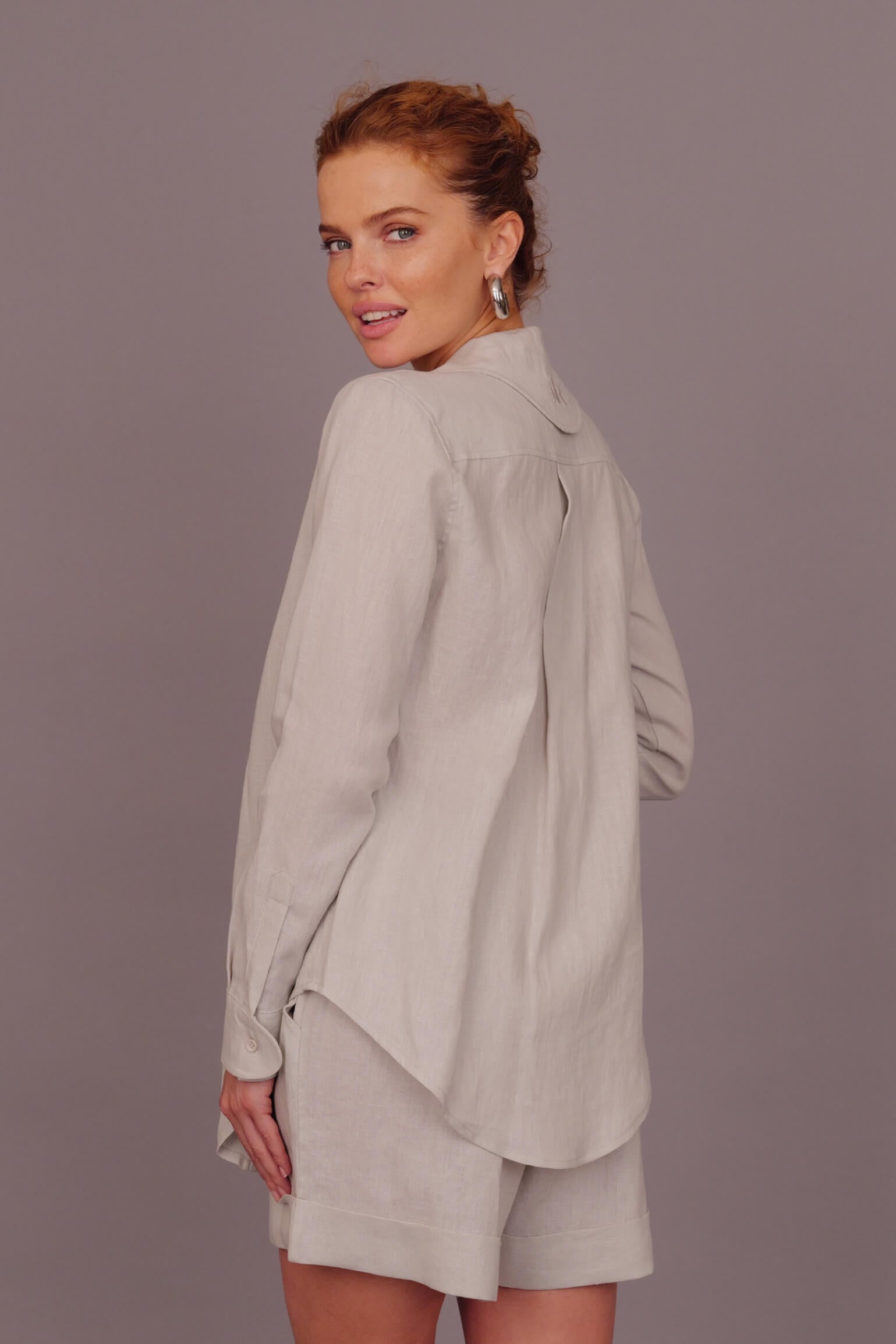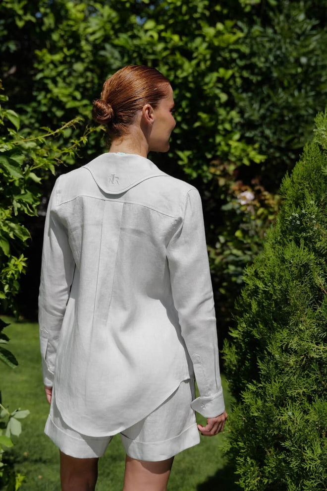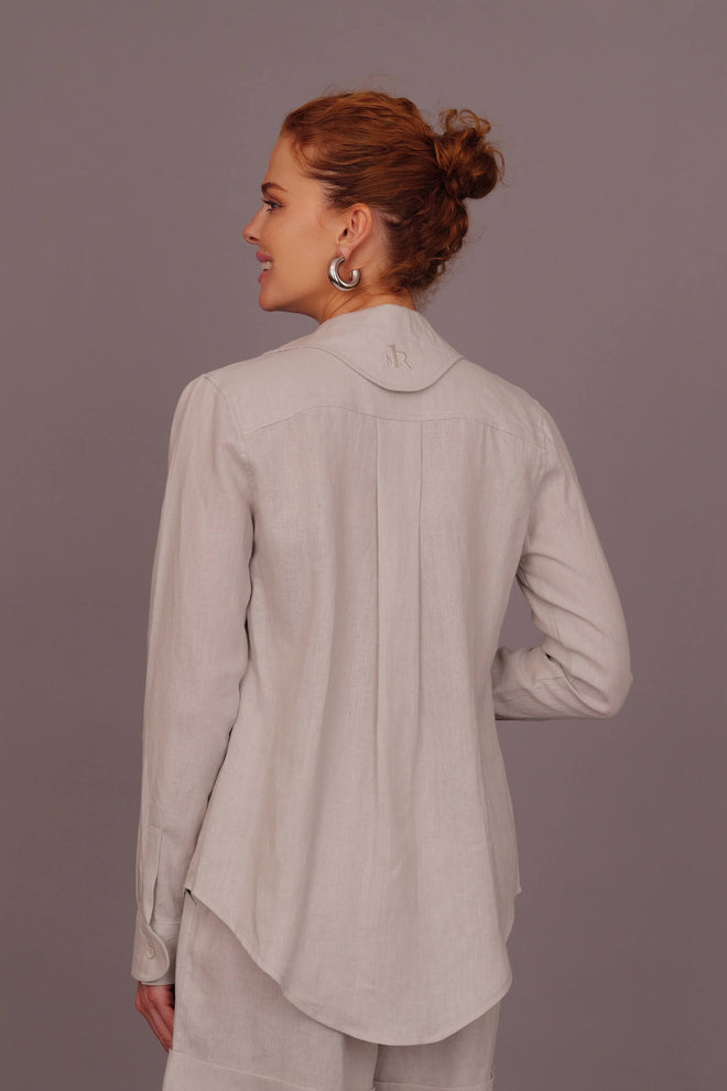 Crafted from 100% natural linen, this lightweight long-sleeve shirt features a relaxed, slightly oversized fit for maximum comfort. It’s designed with a classic collar, soft lapels, and a clean button down front, offering breathability and effortless elegance. A unique touch is added with a special back collar detail, featuring an intricately embroidered logo that elevates the design with a signature finish. The natural texture of the linen provides a refined yet laid back look, perfect for layering or wearing on its own.