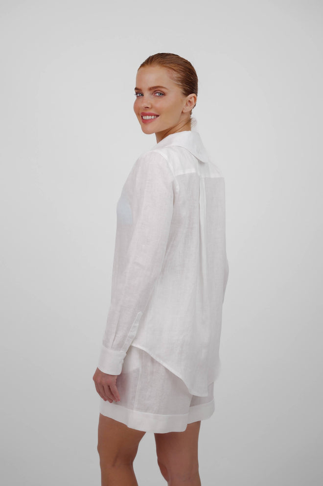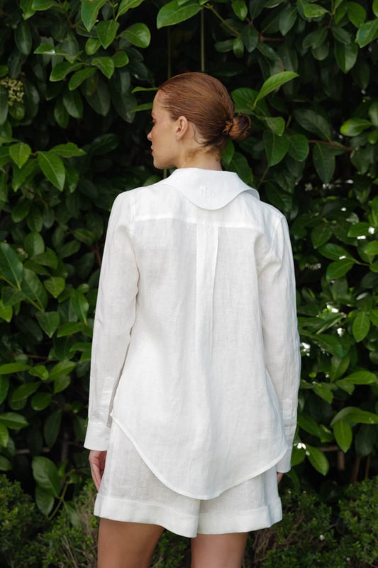 Crafted from 100% natural linen, this lightweight long-sleeve shirt features a relaxed, slightly oversized fit for maximum comfort. It’s designed with a classic collar, soft lapels, and a clean button down front, offering breathability and effortless elegance. A unique touch is added with a special back collar detail, featuring an intricately embroidered logo that elevates the design with a signature finish. The natural texture of the linen provides a refined yet laid back look, perfect for layering or wearing on its own.