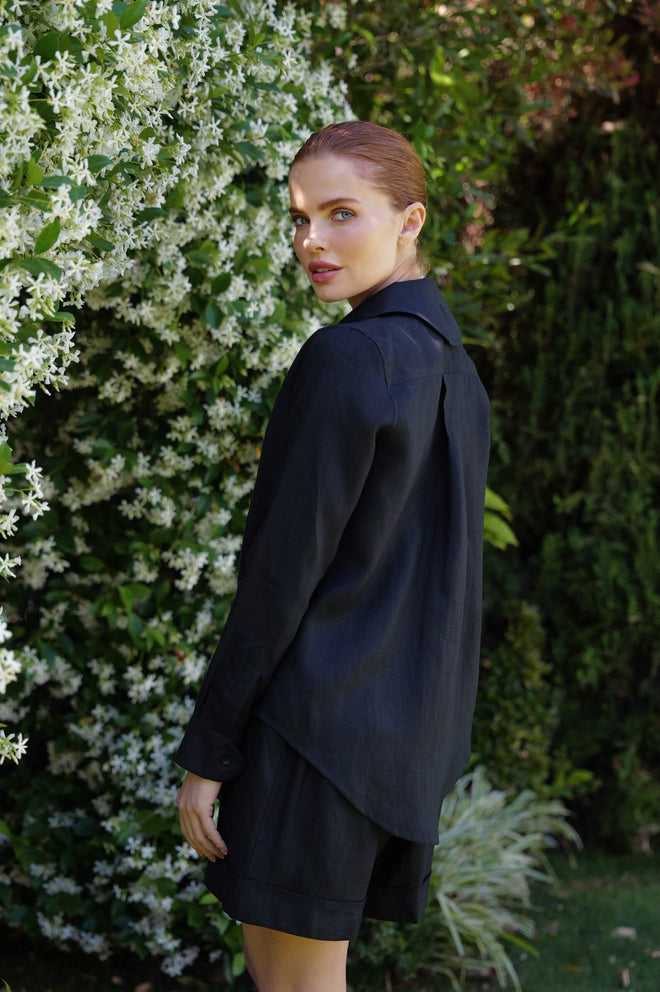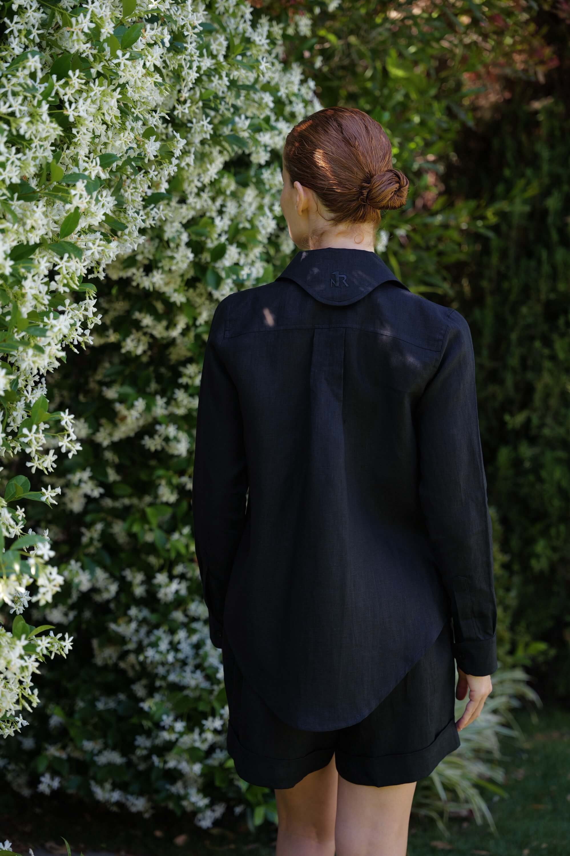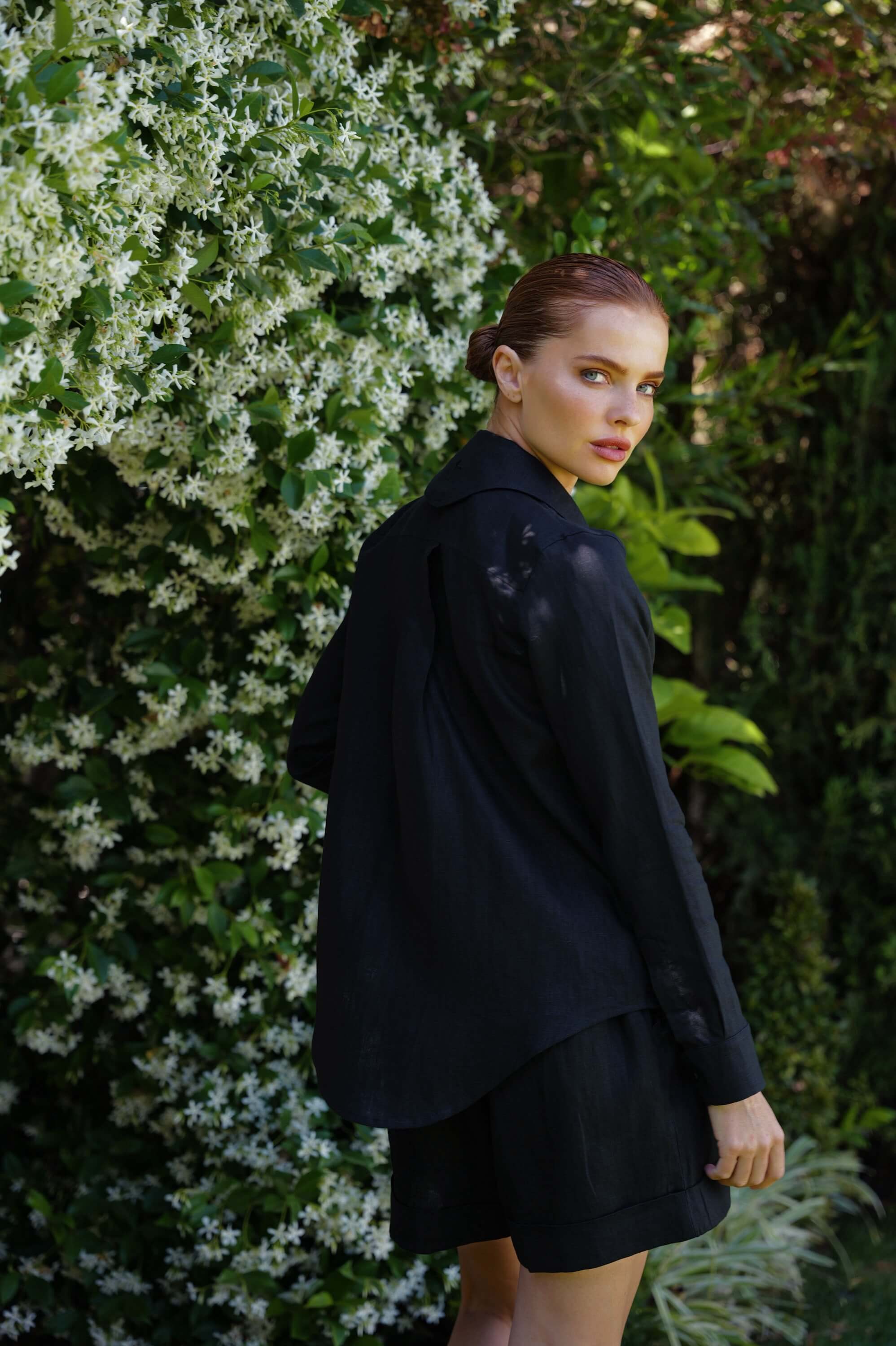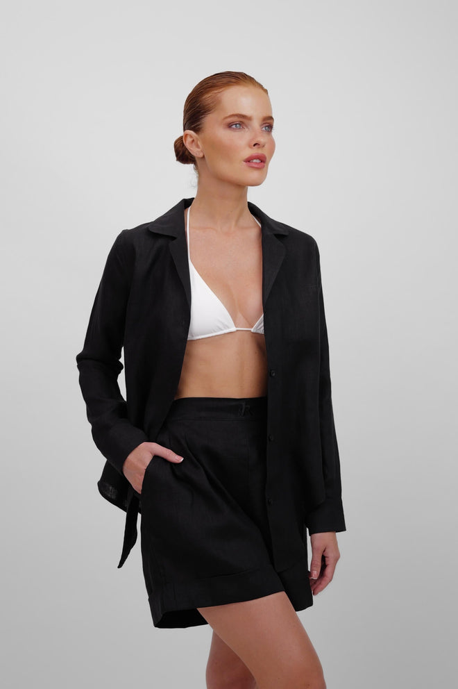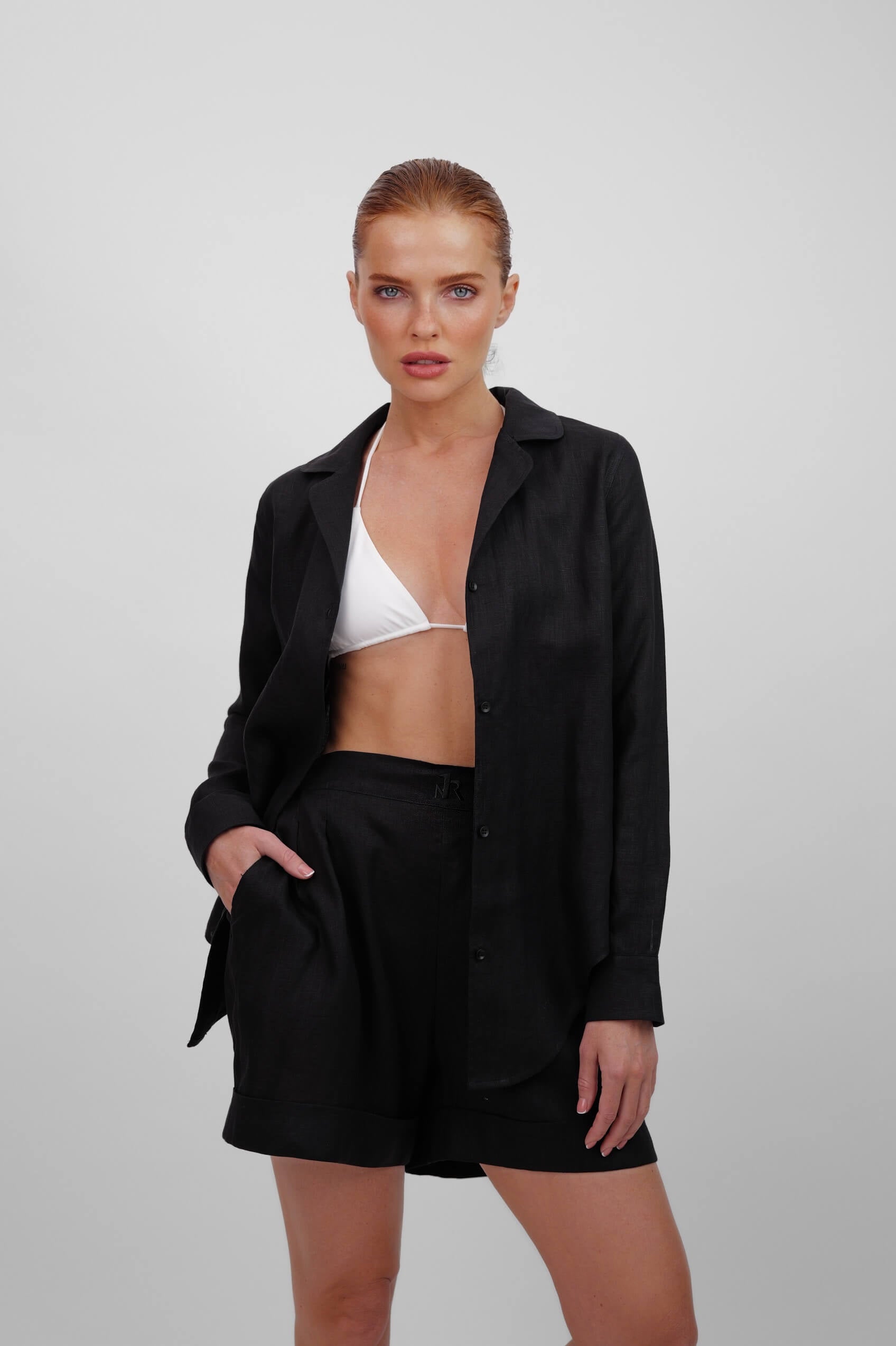 Expertly tailored from 100% natural linen, these high waisted shorts combine structured elegance with breathable comfort. Designed to flatter the silhouette, they feature soft front pleats, discreet side pockets, and a clean back for a smooth finish. The wide waistband offers a defined fit and is adorned with a finely embroidered logo, adding a signature touch of sophistication. With their natural texture and airy feel, these shorts are the perfect balance of polished and effortless ideal for warm days and elevated resort styling.